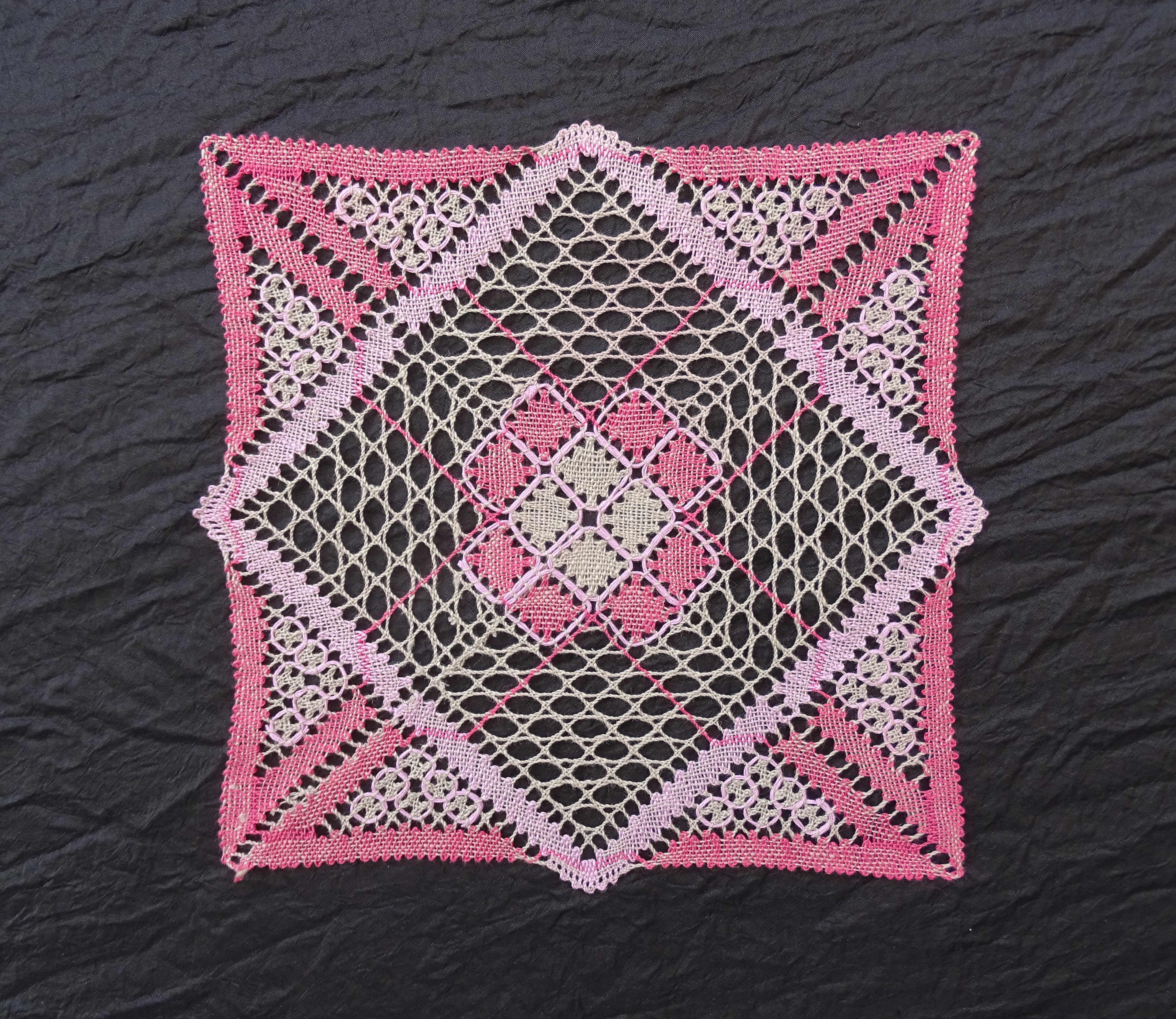 Materialer: Goldschild Nel 50/3 svarer til cirka hør 28/2 eller 35/2 + indlægstråd